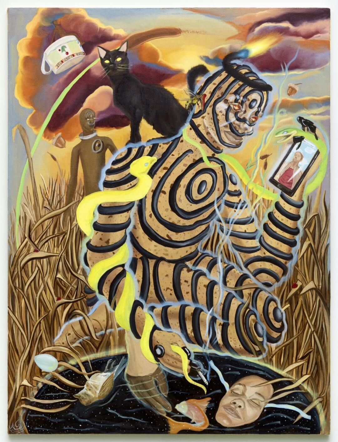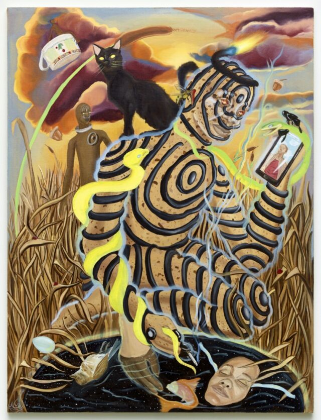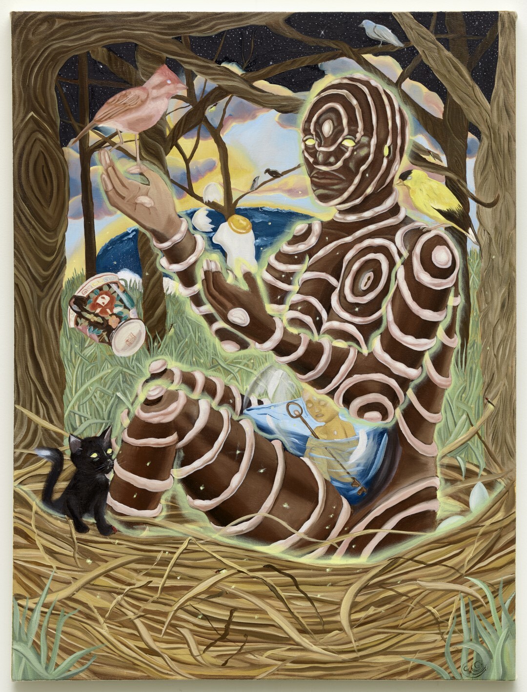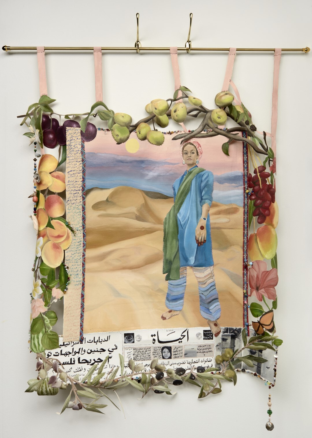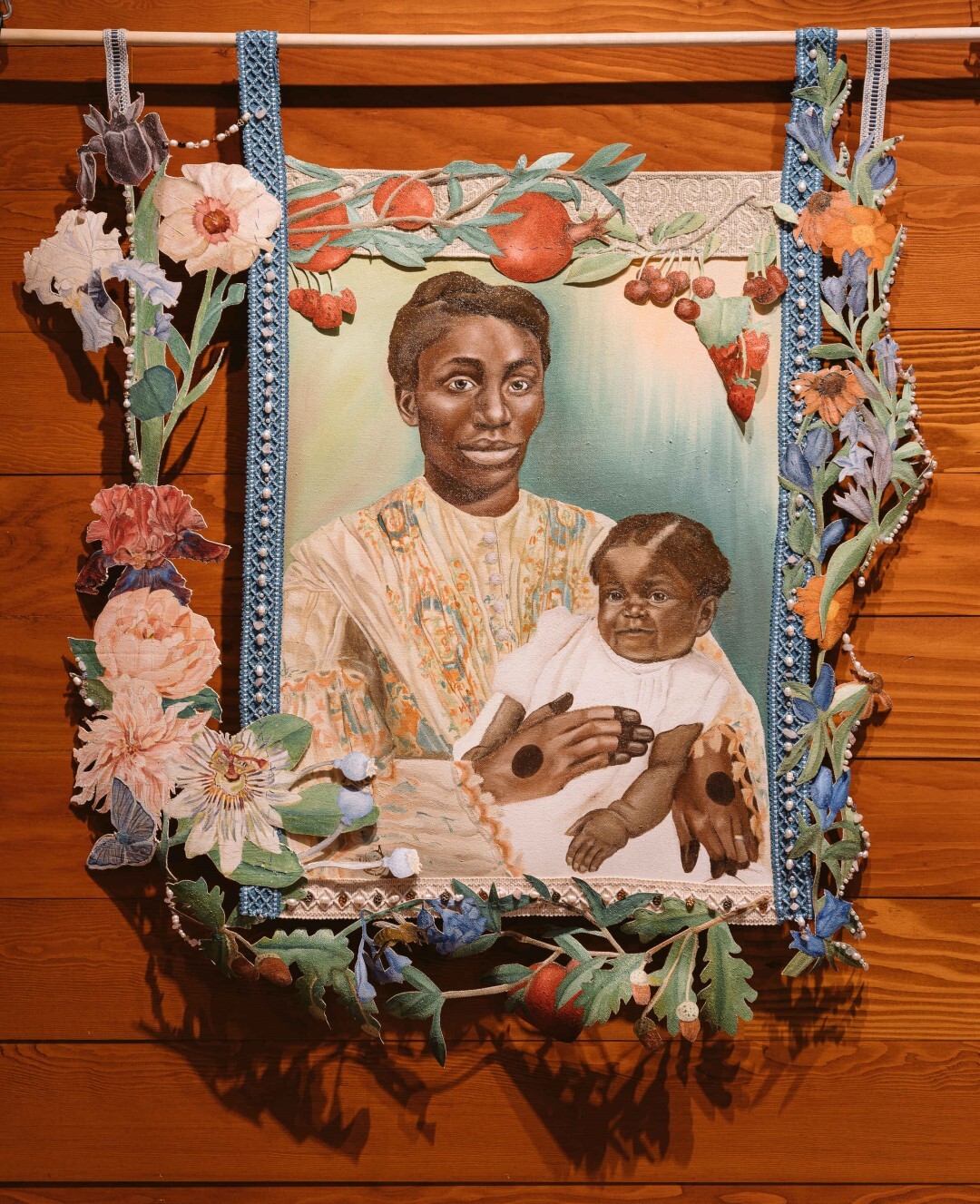 My current project is ‘The Captive Maternal Realm’. This work draws inspiration from the ‘Captive Maternal’ a non-gendered function, and being created by the scholar Dr. Joy James, and the book 'Stolen Women' by clinical psychologist Dr. Gail Elizabeth Wyatt. The paintings reclaim strength and softness of Black women, effeminate presenting men, AFAB (assigned female at birth), and gender non-conforming people, through visually surreal multidisciplinary methods. Paintings are created with woven constructed tapestry oil paintings. I begin each piece with a portrait on canvas, the heart of the painting. On separate pieces of canvas I paint objects, maps, and botanical gardens that symbolize experiences and history of the subject/s. The symbolic images are then sewn to the core (the portrait), as a border; to give shape, insight, or a glimpse of what lies behind the surface of a face. The sculptures are created using found and previously used fabrics, embroidery, beading, and paintings on canvas.