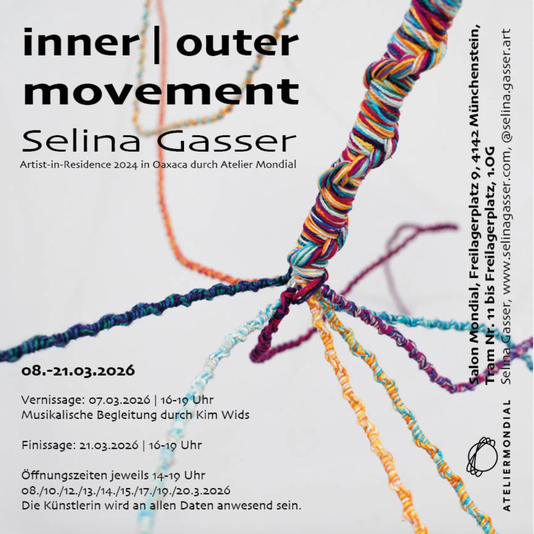 Nous sommes heureux d'annoncer l'ouverture de l'exposition INNER | OUTER MOVEMENT de l'artiste Selina Gasser le samedi 7 mars de 16h à 19h. Dans le cadre du programme d'échange Atelier Mondial, elle a passé six mois à Oaxaca, au Mexique, en 2024. Selina Gasser profitera de cette occasion pour présenter les œuvres qu'elle a créées et développées à Oaxaca pendant son séjour en résidence et donnera un aperçu de son exploration artistique pendant son séjour.